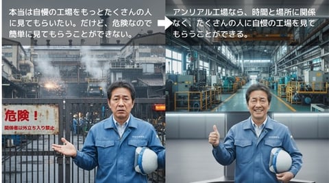 そこで当社は、得意とする3D空間の制作技術を応用し、市販の3Dカメラやドローンを用いた「アンリアルスペース」の制作を実現しました。これまでのデジタルツインが精緻な構造の再現を目指しているのに対し、アンリアルスペースは見た目の再現にフォーカスしています。これにより、コストを抑えながら限りなく現実に近い見た目の空間の再現が可能となり、中小企業でも導入がしやすくなりました。例えば製造業の工場であれば、レイアウト検討や安全確認、社員教育や遠隔見学など、さまざまな用途での活用が期待されています。