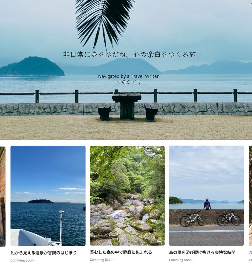 トラベルライターとして数多くの場所へ足を運ぶ中で「旅に出ることの価値」について、深く考えるようになりました。山奥の温泉地やフェリーに乗ってたどり着く小さな島などへの旅を通じて強く実感するようになったのは「非日常な場所に身を置くことで見えてくるものがある」ということ。その気づきをもとに、自身が提唱したい旅のスタイルはどのようなものなのか、それはどんな展開へとつなげることができそうかを、KIPの支援を受けつつ形にしてきました。まだ道半ばではありますが、ぜひサイトを訪れて、その世界観に触れていただけたらと思います。