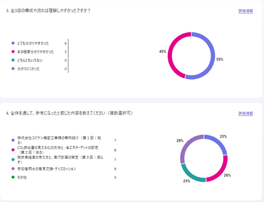 自転車通勤を推奨する、エコドライブを推奨する、設備の電源オンオフを管理するなども取り組みの1つになると知り、参考になりました。 - 参加者の実際に取り組もうという意識が高く刺激になりました。