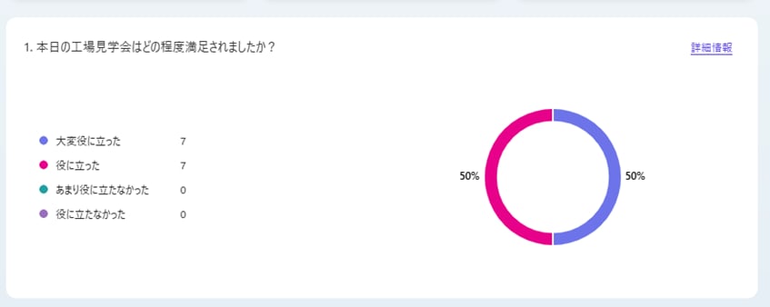 - 工場見学の案内が、社員の方であったのがよかったです。社員教育として、外部の方からの質問への対応やご指摘がその方々の成長となるきっかけであれば尚更です。