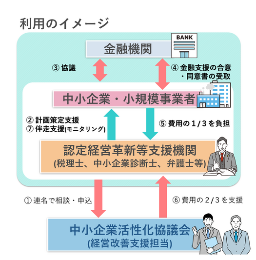 本事業は、こうした中小企業・小規模事業者が、金融機関からの金融支援を受けるために金融機関が必要とする経営改善計画を、中小企業経営力強化支援法に基づき認定された経営革新等支援機関(以下「認定支援機関※」)に策定支援を依頼し、その費用の一部(上限300万円)を国が負担することにより、中小企業・小規模事業者の経営改善を促進するものです。